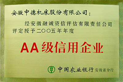 日前,經安徽融誠資信評估有限責任公司評定,安徽中德機床股份有限公司再次被中國農業銀行安徽省分行授予二00五年年級AA級信用企業。