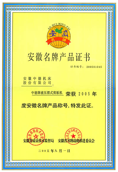 “中德牌”剪板機榮獲2005年“安徽名牌產(chǎn)品”稱號