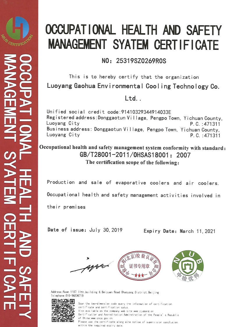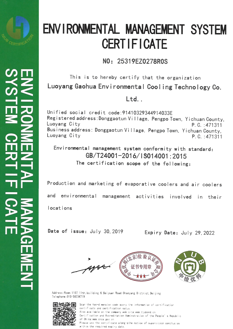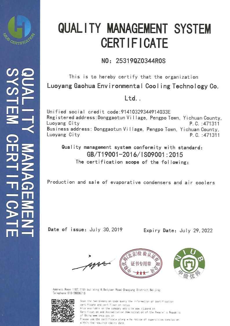 在洛陽(yáng)高華環(huán)保公司全體員工及合作伙伴的不懈努力下,經(jīng)過(guò)認(rèn)證公司專家的***、嚴(yán)格、細(xì)致的指導(dǎo)和審核,確認(rèn)洛陽(yáng)高華環(huán)保冷卻科技有限公司的蒸發(fā)式冷卻(凝)設(shè)備、空冷器的生產(chǎn)和銷售的質(zhì)量管理體系符合:GB/T19001-2016/ISO9001:2015 標(biāo)準(zhǔn)的要求,并于2019年7月30日,向洛陽(yáng)高華環(huán)保冷卻科技有限公司正式頒發(fā)了ISO9001質(zhì)量管理體系認(rèn)證證書(shū)。